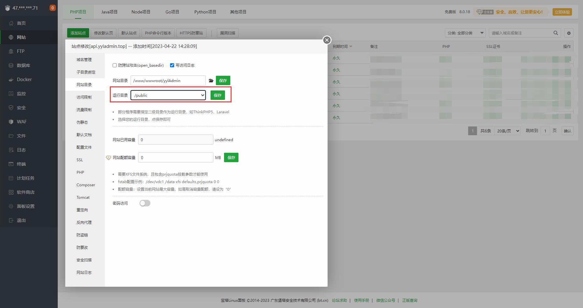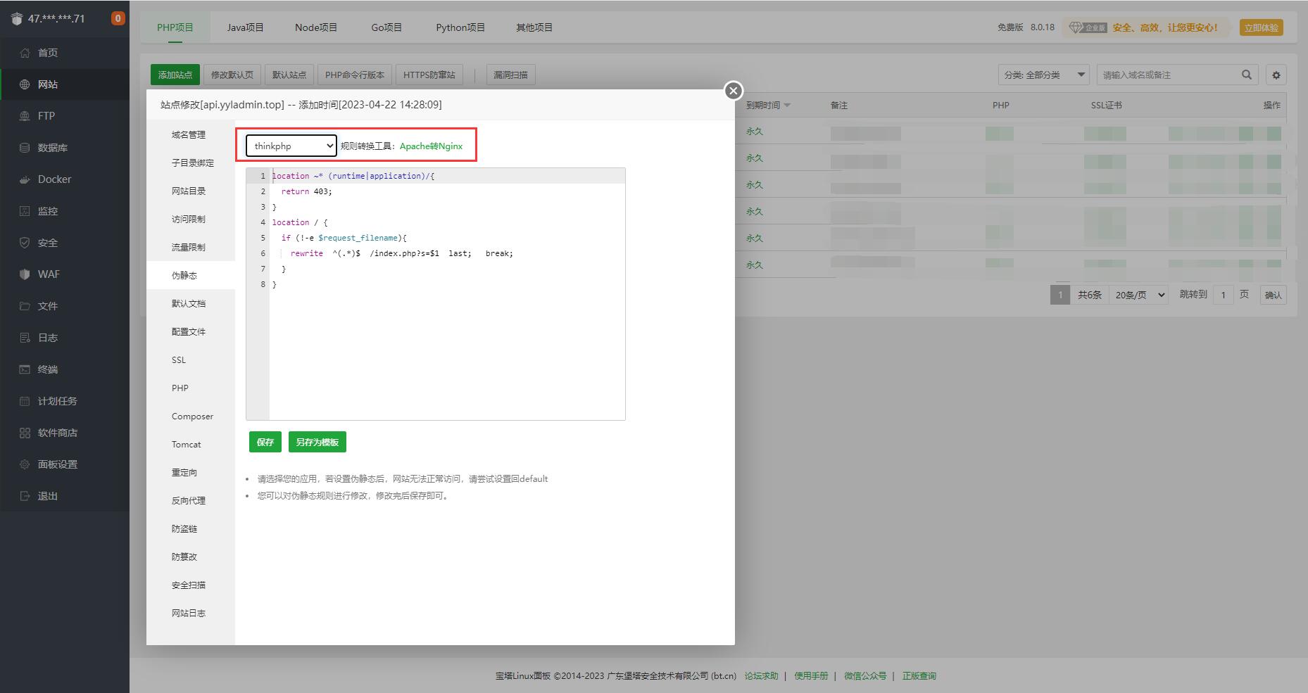 设置网站运行目录和伪静态。