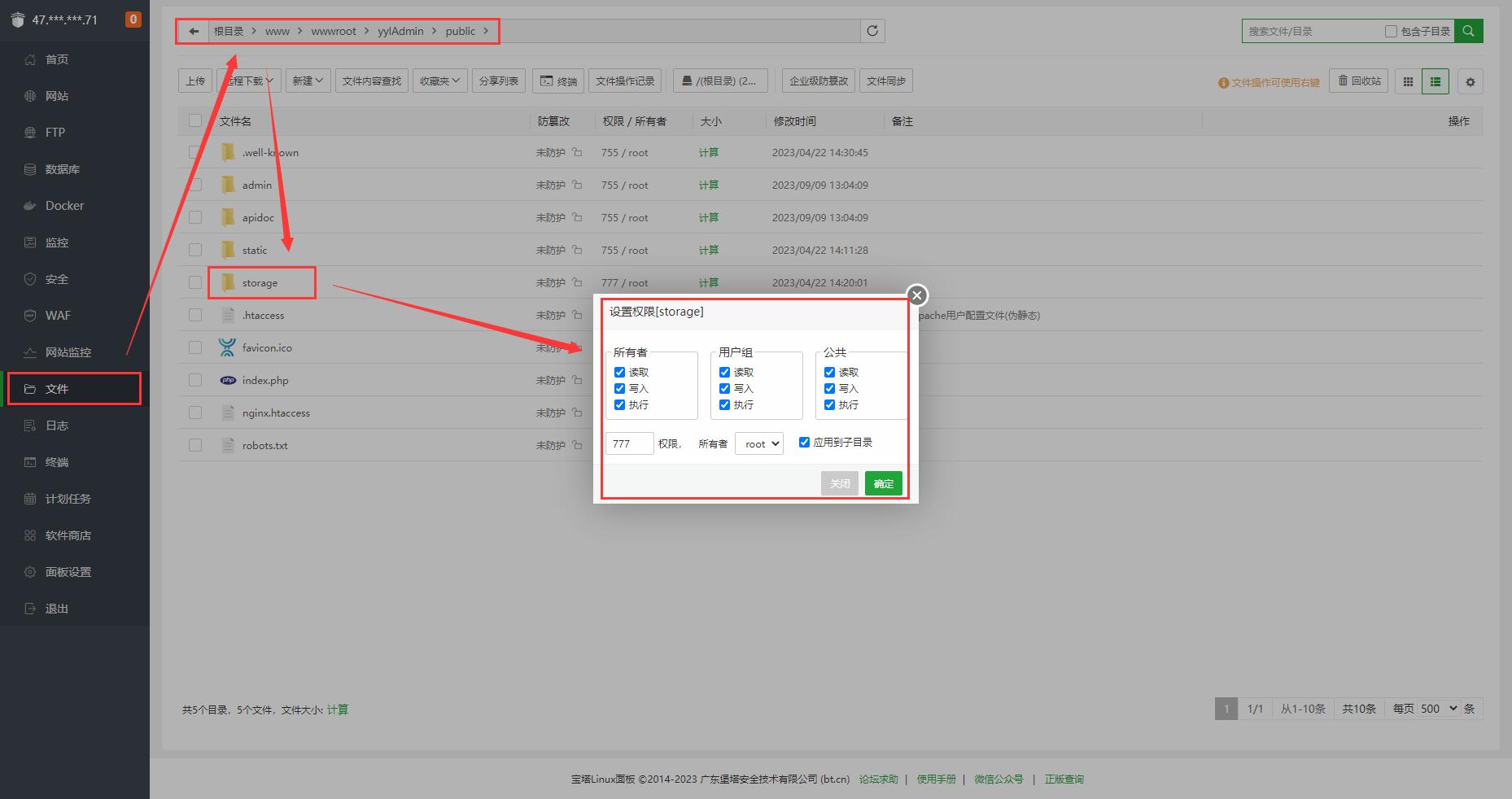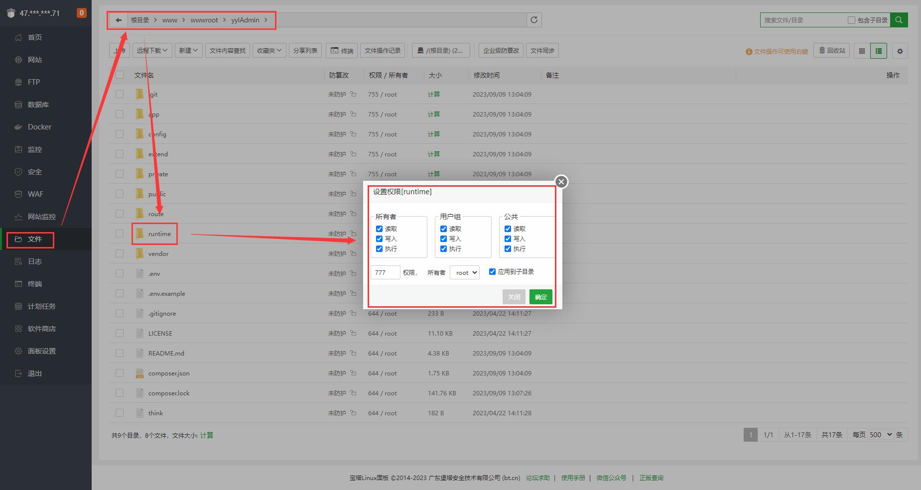 设置网站runtime和public/storage目录读写权限。