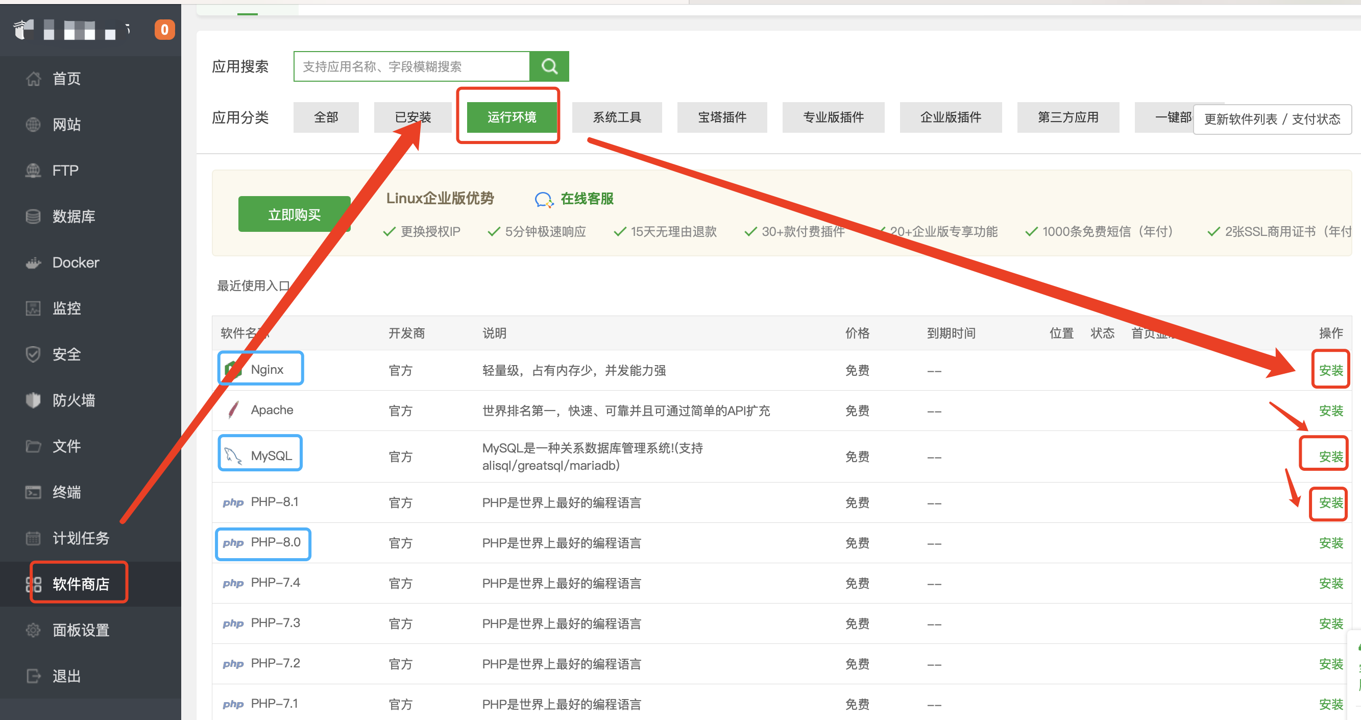 点击【软件商店】-【运行环境】,安装Nginx(>=1.20)、MySQL(>=5.5)、PHP(>=8.0)、node(>=18.18)、npm(>=8.19)。